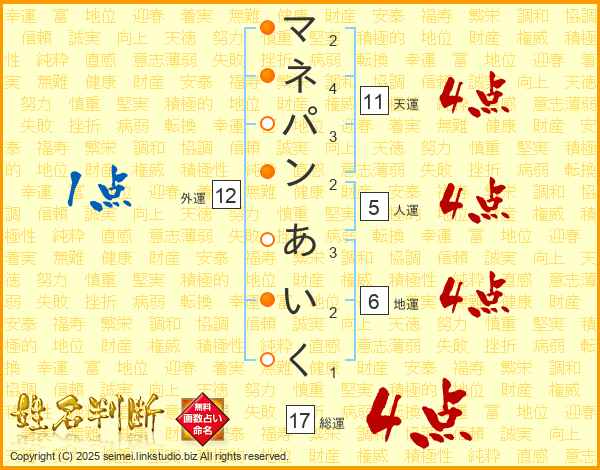 生活面を象徴する運勢です。外部から受ける影響力を表し、結婚運、家庭運や職場、環境への順応性を表します。総運から人運を引いた画数。姓や名が1文字の場合を除く。