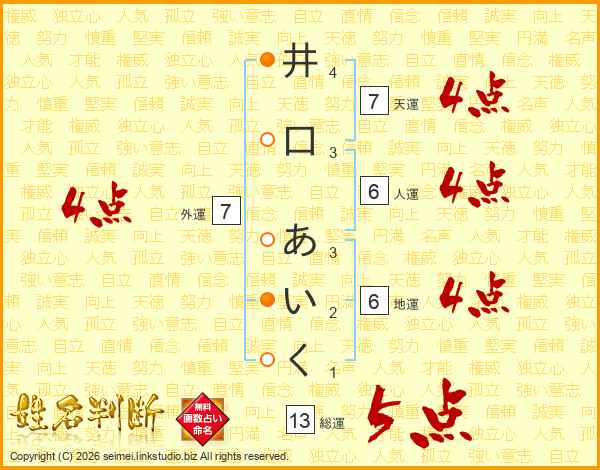 生活面を象徴する運勢です。外部から受ける影響力を表し、結婚運、家庭運や職場、環境への順応性を表します。総運から人運を引いた画数。姓や名が1文字の場合を除く。
