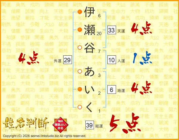 伊(6画)瀬(20画)谷(7画) あ(3画)い(2画)く(1画)