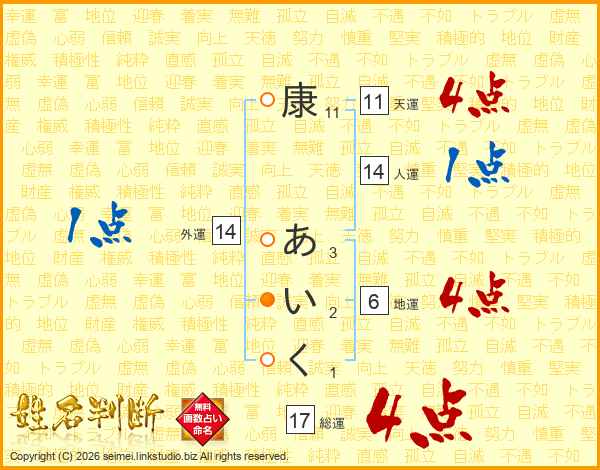 生活面を象徴する運勢です。外部から受ける影響力を表し、結婚運、家庭運や職場、環境への順応性を表します。総運から人運を引いた画数。姓や名が1文字の場合を除く。