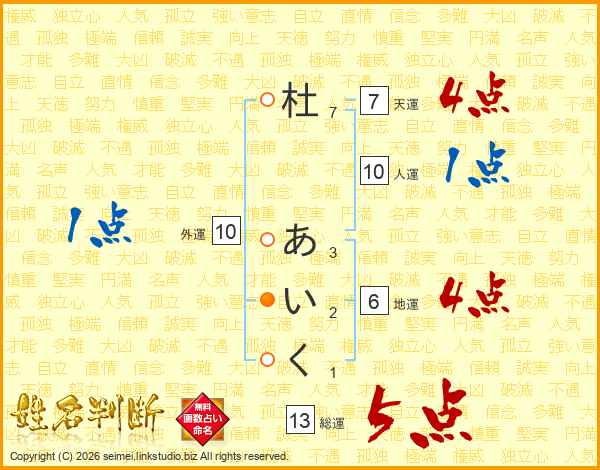 生活面を象徴する運勢です。外部から受ける影響力を表し、結婚運、家庭運や職場、環境への順応性を表します。総運から人運を引いた画数。姓や名が1文字の場合を除く。