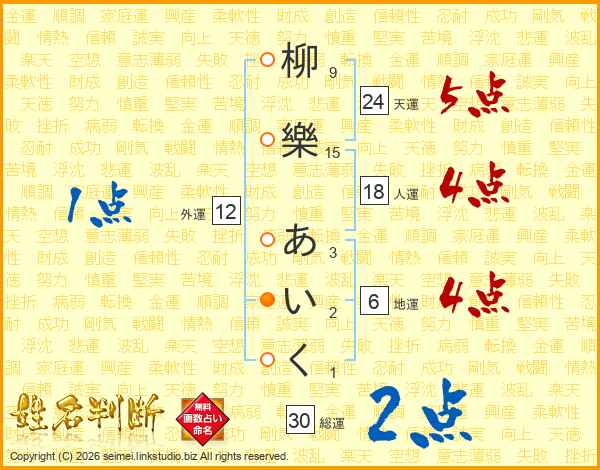 柳(9画)樂(15画) あ(3画)い(2画)く(1画)