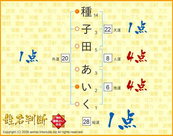 種(14画)子(3画)田(5画) あ(3画)い(2画)く(1画)