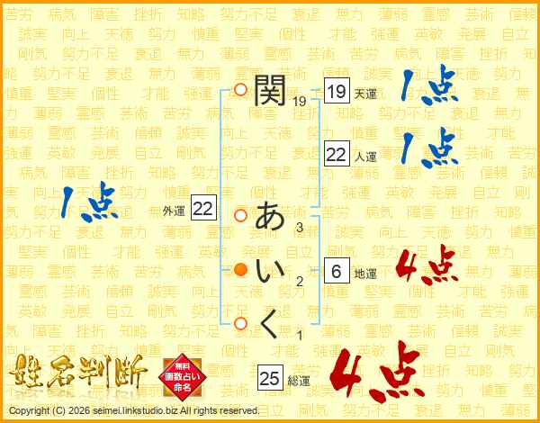 関あいくさんの総運は25画の4点!