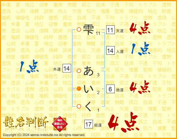 生活面を象徴する運勢です。外部から受ける影響力を表し、結婚運、家庭運や職場、環境への順応性を表します。総運から人運を引いた画数。姓や名が1文字の場合を除く。