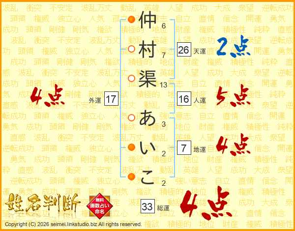 仲(6画)村(7画)渠(13画) あ(3画)い(2画)こ(2画)