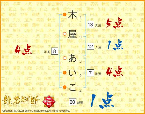 木屋あいこさんの天運は13画の5点!