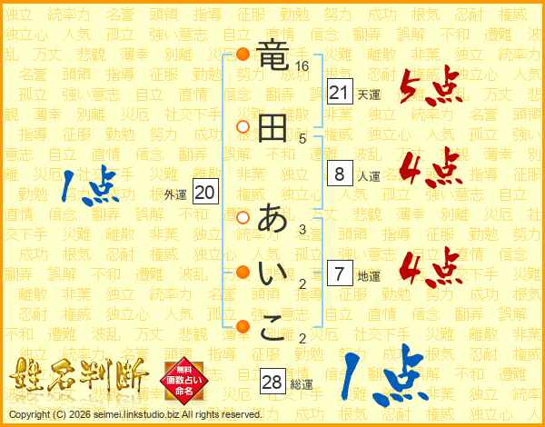 竜田あいこさんの総運は28画の1点!