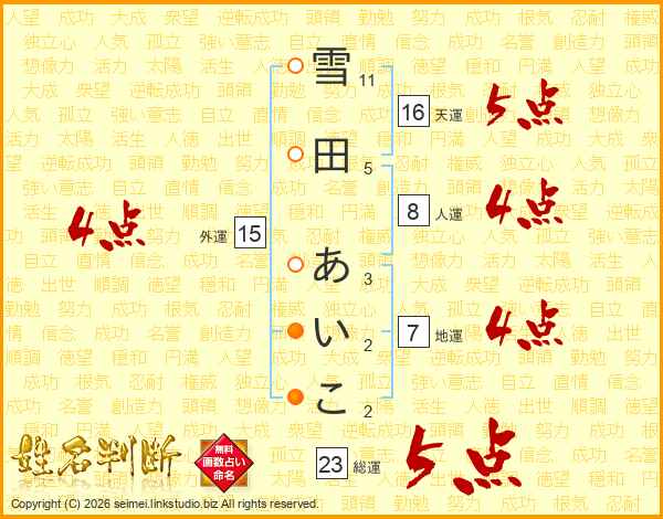雪(11画)田(5画) あ(3画)い(2画)こ(2画)