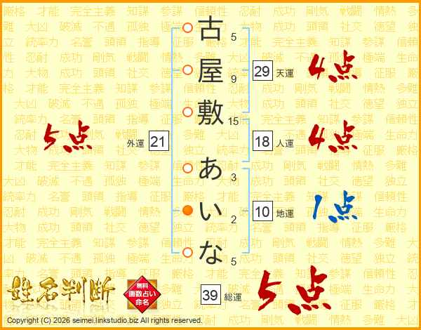 古(5画)屋(9画)敷(15画) あ(3画)い(2画)な(5画)