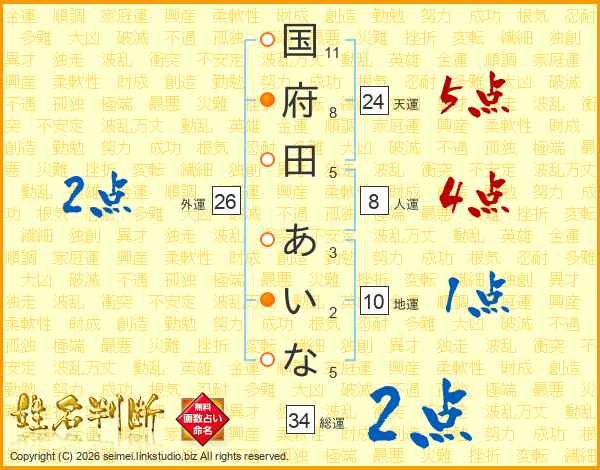 国(11画)府(8画)田(5画) あ(3画)い(2画)な(5画)