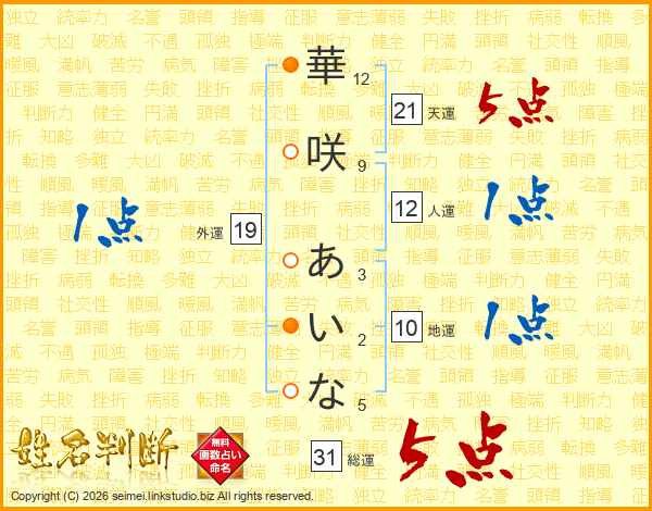 華(12画)咲(9画) あ(3画)い(2画)な(5画)
