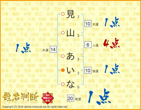生活面を象徴する運勢です。外部から受ける影響力を表し、結婚運、家庭運や職場、環境への順応性を表します。総運から人運を引いた画数。姓や名が1文字の場合を除く。