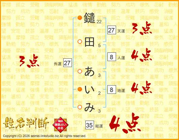鑓田あいみさんの総運は35画の4点!