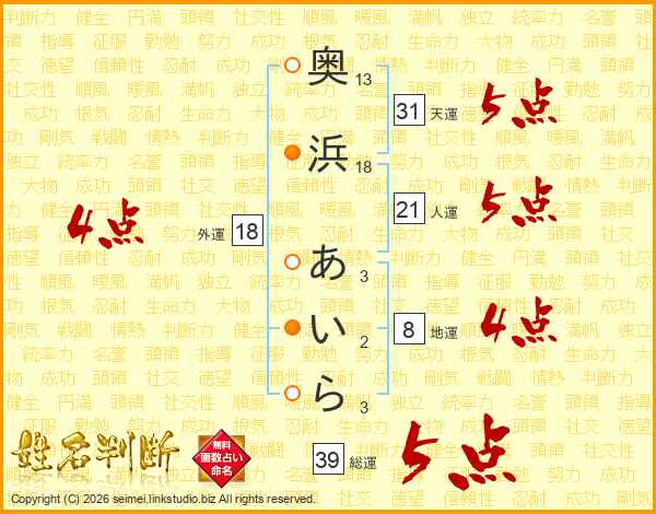 奥浜あいらさんの総運は39画の5点!