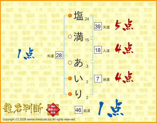 塩(24画)満(15画) あ(3画)い(2画)り(2画)