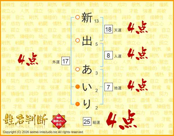 生活面を象徴する運勢です。外部から受ける影響力を表し、結婚運、家庭運や職場、環境への順応性を表します。総運から人運を引いた画数。姓や名が1文字の場合を除く。