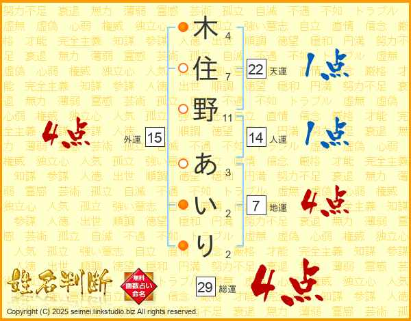 木(4画)住(7画)野(11画) あ(3画)い(2画)り(2画)