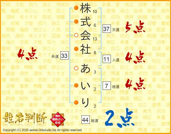 株(10画)式(6画)会(13画)社(8画) あ(3画)い(2画)り(2画)