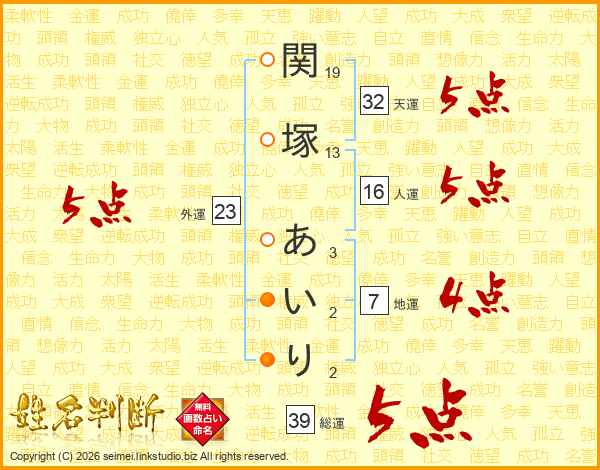 関塚あいりさんの総運は39画の5点!