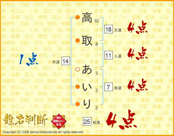 高取あいりさんの総運は25画の4点!