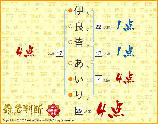 伊(6画)良(7画)皆(9画) あ(3画)い(2画)り(2画)