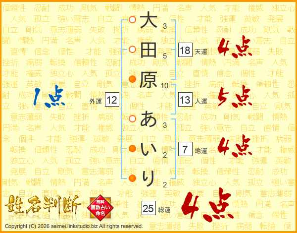 大田原あいりさんの天運は18画の4点!