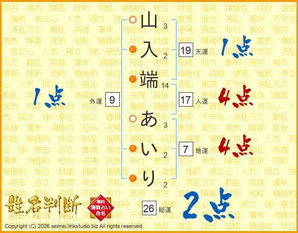 生活面を象徴する運勢です。外部から受ける影響力を表し、結婚運、家庭運や職場、環境への順応性を表します。総運から人運を引いた画数。姓や名が1文字の場合を除く。