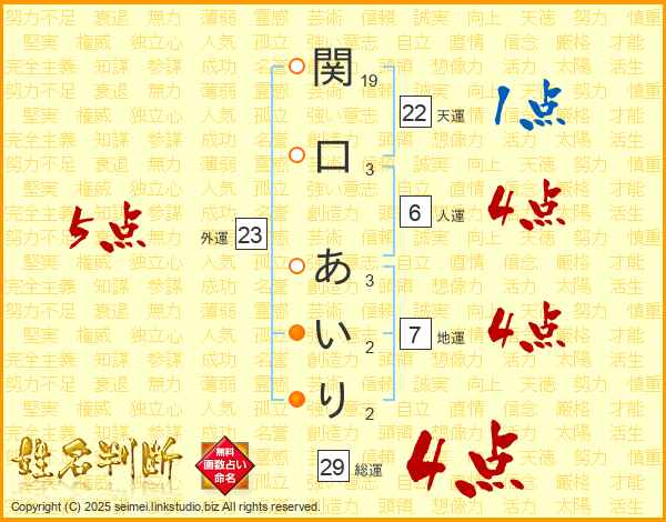 生活面を象徴する運勢です。外部から受ける影響力を表し、結婚運、家庭運や職場、環境への順応性を表します。総運から人運を引いた画数。姓や名が1文字の場合を除く。