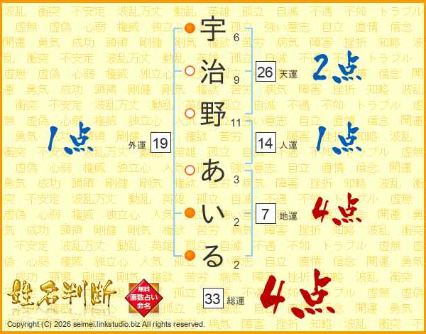 宇(6画)治(9画)野(11画) あ(3画)い(2画)る(2画)