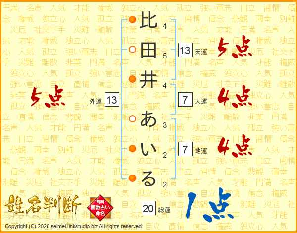 生活面を象徴する運勢です。外部から受ける影響力を表し、結婚運、家庭運や職場、環境への順応性を表します。総運から人運を引いた画数。姓や名が1文字の場合を除く。