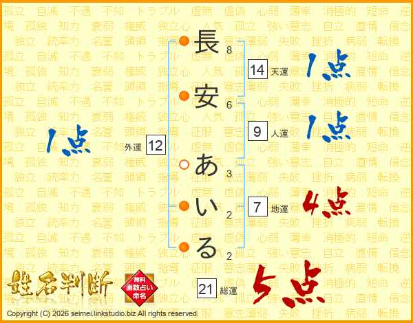 長(8画)安(6画) あ(3画)い(2画)る(2画)