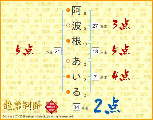 阿波根あいるさんの総運は34画の2点!