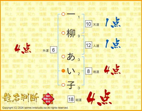 一(1画)柳(9画) あ(3画)い(2画)子(3画)
