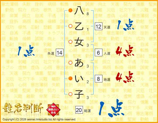 八乙女あい子さんの総運は20画の1点!