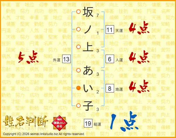 生活面を象徴する運勢です。外部から受ける影響力を表し、結婚運、家庭運や職場、環境への順応性を表します。総運から人運を引いた画数。姓や名が1文字の場合を除く。