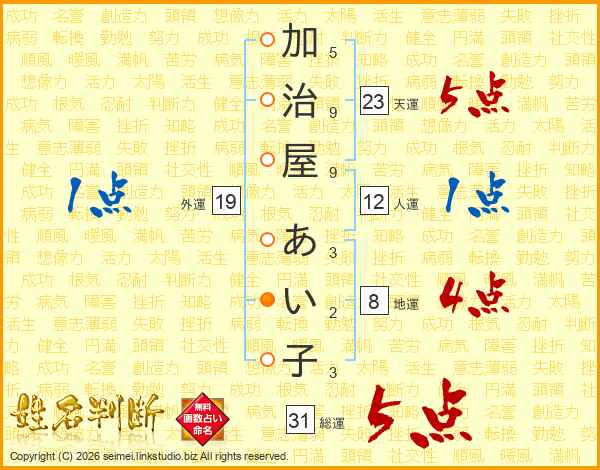 加治屋あい子さんの総運は31画の5点!