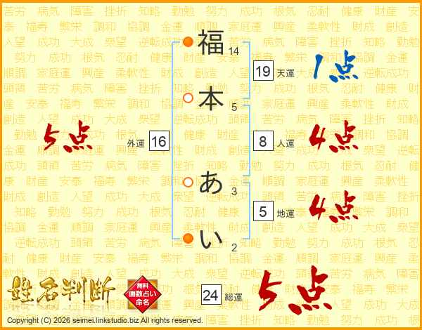 生活面を象徴する運勢です。外部から受ける影響力を表し、結婚運、家庭運や職場、環境への順応性を表します。総運から人運を引いた画数。姓や名が1文字の場合を除く。
