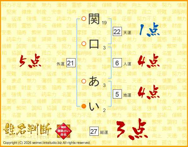 生活面を象徴する運勢です。外部から受ける影響力を表し、結婚運、家庭運や職場、環境への順応性を表します。総運から人運を引いた画数。姓や名が1文字の場合を除く。