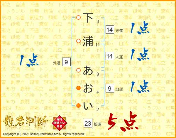 下浦あおいさんの総運は23画の5点!