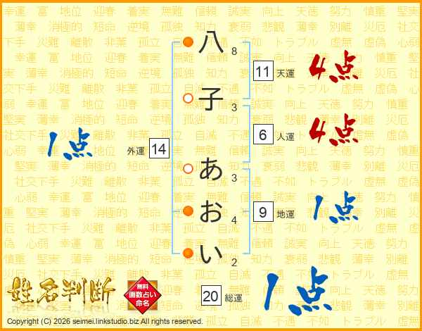 生活面を象徴する運勢です。外部から受ける影響力を表し、結婚運、家庭運や職場、環境への順応性を表します。総運から人運を引いた画数。姓や名が1文字の場合を除く。
