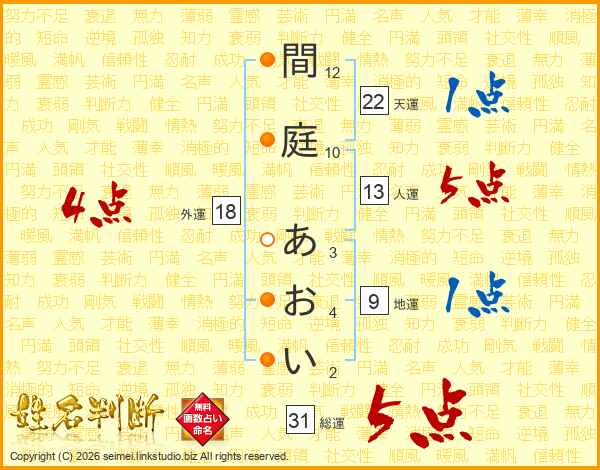生活面を象徴する運勢です。外部から受ける影響力を表し、結婚運、家庭運や職場、環境への順応性を表します。総運から人運を引いた画数。姓や名が1文字の場合を除く。