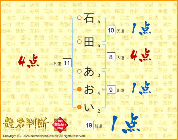 生活面を象徴する運勢です。外部から受ける影響力を表し、結婚運、家庭運や職場、環境への順応性を表します。総運から人運を引いた画数。姓や名が1文字の場合を除く。