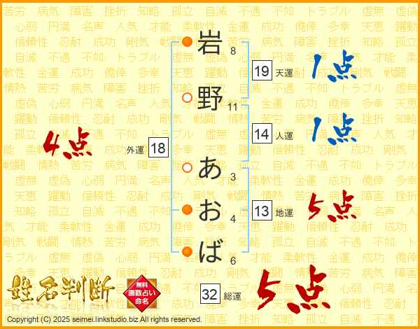 生活面を象徴する運勢です。外部から受ける影響力を表し、結婚運、家庭運や職場、環境への順応性を表します。総運から人運を引いた画数。姓や名が1文字の場合を除く。