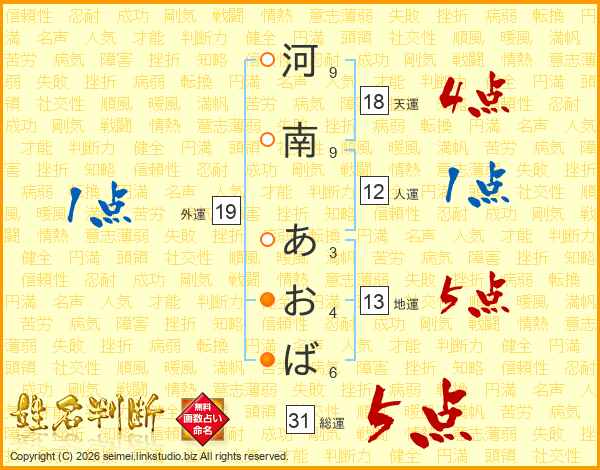 生活面を象徴する運勢です。外部から受ける影響力を表し、結婚運、家庭運や職場、環境への順応性を表します。総運から人運を引いた画数。姓や名が1文字の場合を除く。