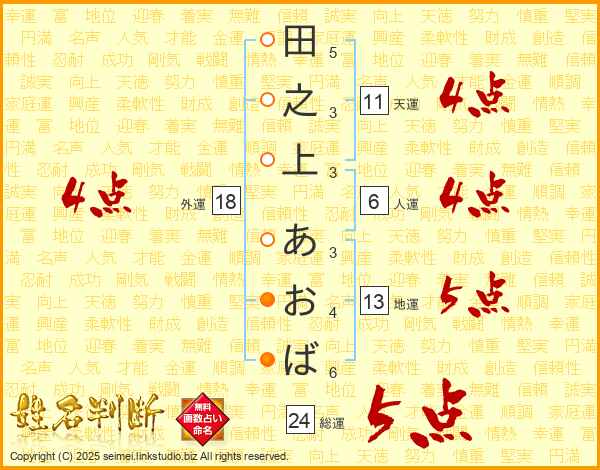 田(5画)之(3画)上(3画) あ(3画)お(4画)ば(6画)
