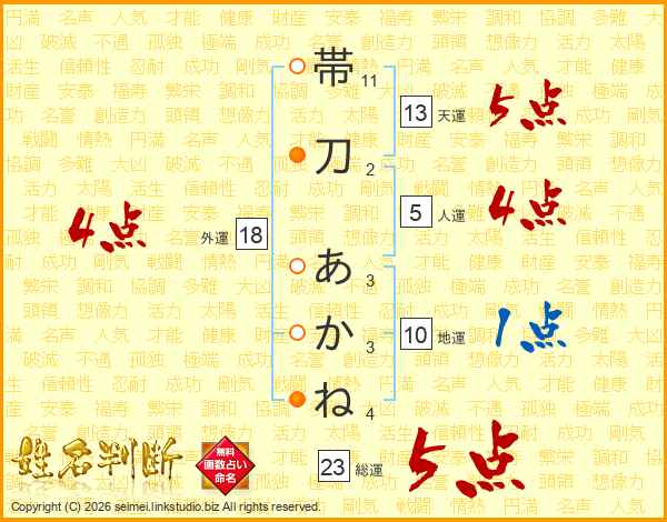 帯刀あかねさんの総運は23画の5点!