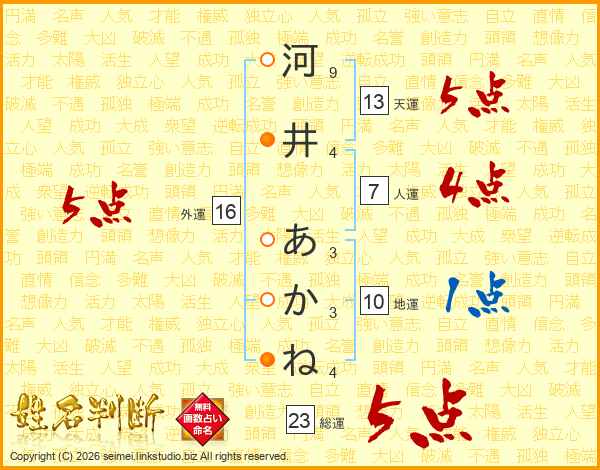 河(9画)井(4画) あ(3画)か(3画)ね(4画)