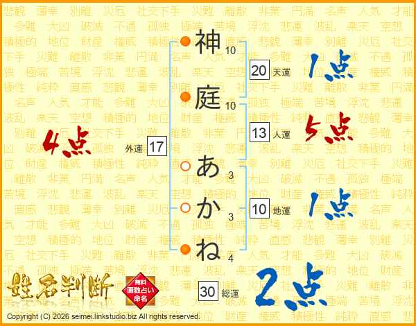 神(10画)庭(10画) あ(3画)か(3画)ね(4画)