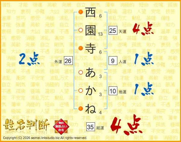 西園寺あかねさんの総運は35画の4点!